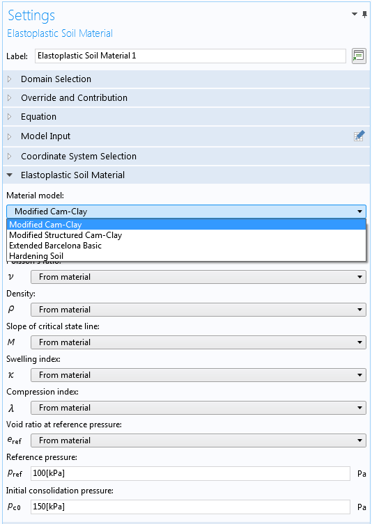 A new family of soil material models has been added with the new Elastoplastic Soil Material feature in which the elastic and plastic behaviors are not independent. One such material model (Cam-Clay) existed in previous versions of the COMSOL® software and it has now been improved and renamed Modified Cam-Clay. The other three materials, commonly used in the geomechanics community, are Hardening Soil, Extended Barcelona Basic, and Modified Structured Cam-Clay.