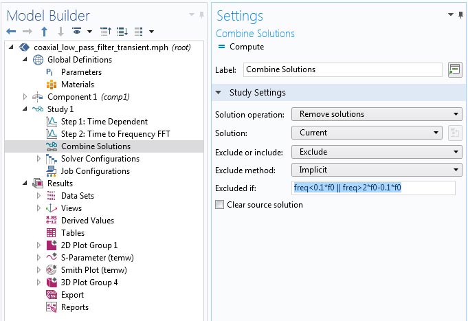 The Combine Solutions study step can be used to filter out and remove unwanted solutions. This functionality can be used, for example, to filter out the first and last % of the frequency spectrum for a Time to Frequency FFT study step. Parts of the solution can be excluded based on a user-defined expression.