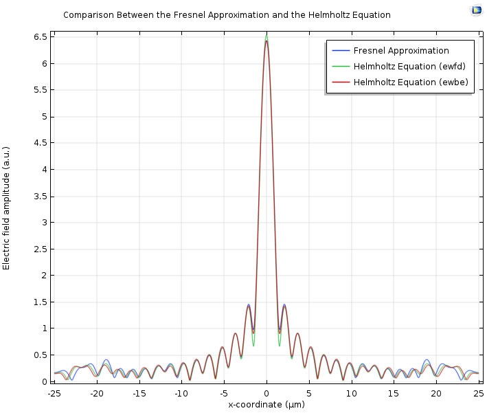 An updated comparison plot that includes the results from a simulation with the Electromagnetic Waves, Beam Envelopes interface.Application Library path: