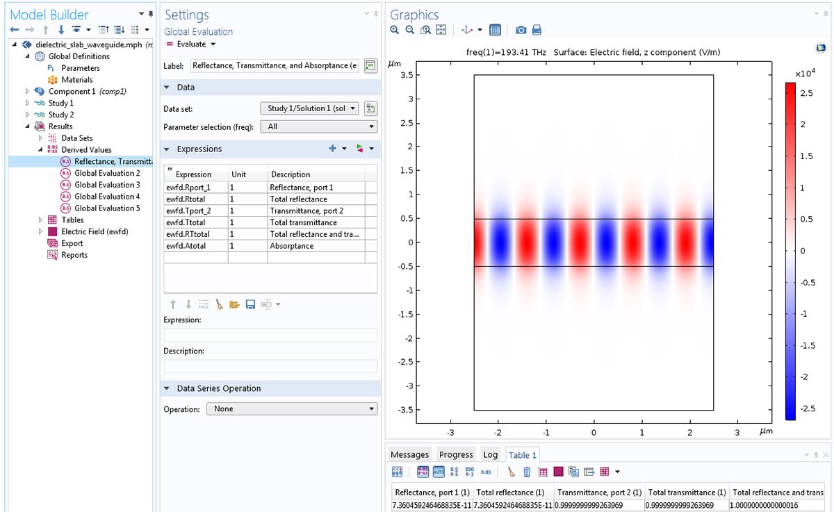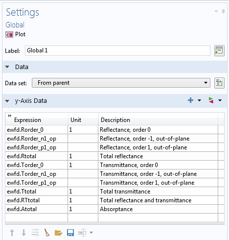 For frequency or wavelength sweeps, parametric sweeps, and auxiliary sweeps, new default plots of the reflectances and transmittances are generated. When the study does not perform any sweeps, instead of a default plot, a global evaluation is evaluated in a table for the reflectance and transmittance variables.