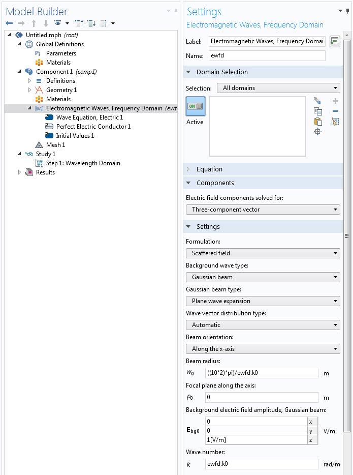 When you add a frequency- or wavelength-dependent study step, for instance the Wavelength Domain or the Frequency Domain study step, together with either of the Electromagnetic Waves, Frequency Domain or Electromagnetic Waves, Beam Envelopes physics interfaces, a default wavelength of 1 μm will be used.