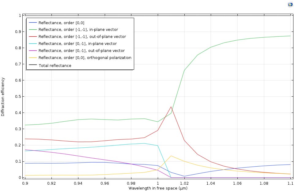 New postprocessing variables have been introduced to simplify the evaluation of reflectance, transmittance, and absorptance expressions. For instance, instead of writing abs(ewfd.S11)^2 for the reflectance at port 1, you can now simply write ewfd.Rport_1. The variables named ewfd.Rport_<x> and ewfd.Tport_<x> are based on the port name <x>. Similarly, when periodic ports and diffraction order ports are used, there are new variables based on the mode number and the mode polarization. For instance, the variable ewfd.Rorder_p1_op represents the reflectance, for a 2D mode, with order 1 and out-of-plane polarization. In addition, there are summation variables for the total reflectance, total transmittance, total reflectance and transmittance, and the absorptance.