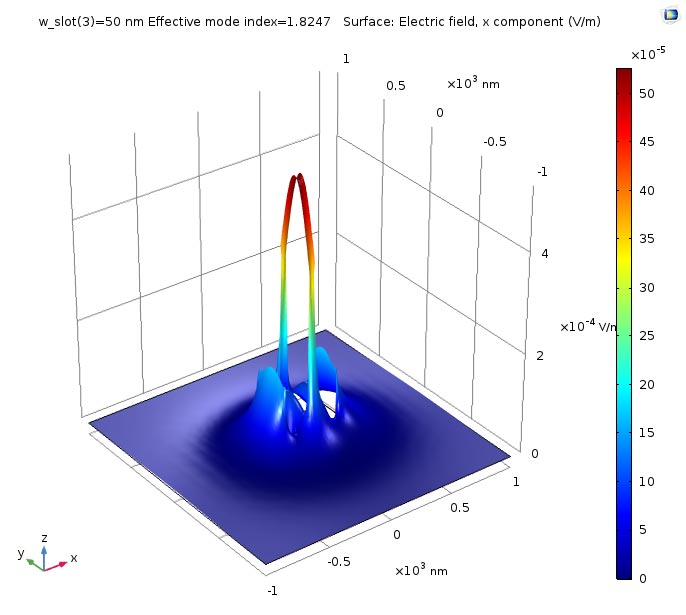 This surface plot shows the confinement of the light to the central low-index slot area. The plot variable is the x-component of the electric field.