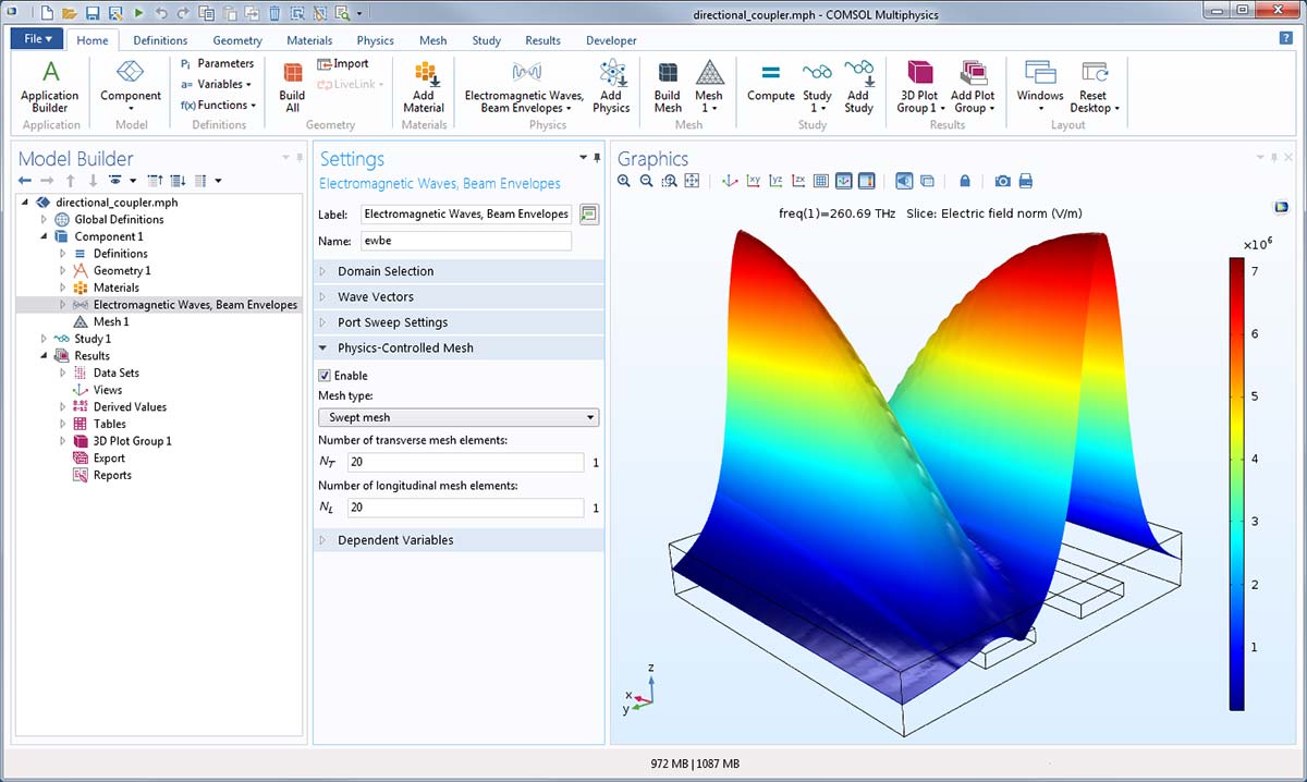The new Physics-Controlled Mesh section of the Electromagnetic Waves, Beam Envelopes interface settings, as exemplified for the Directional Coupler tutorial model.Application Library paths for examples using the new physics-controlled mesh: