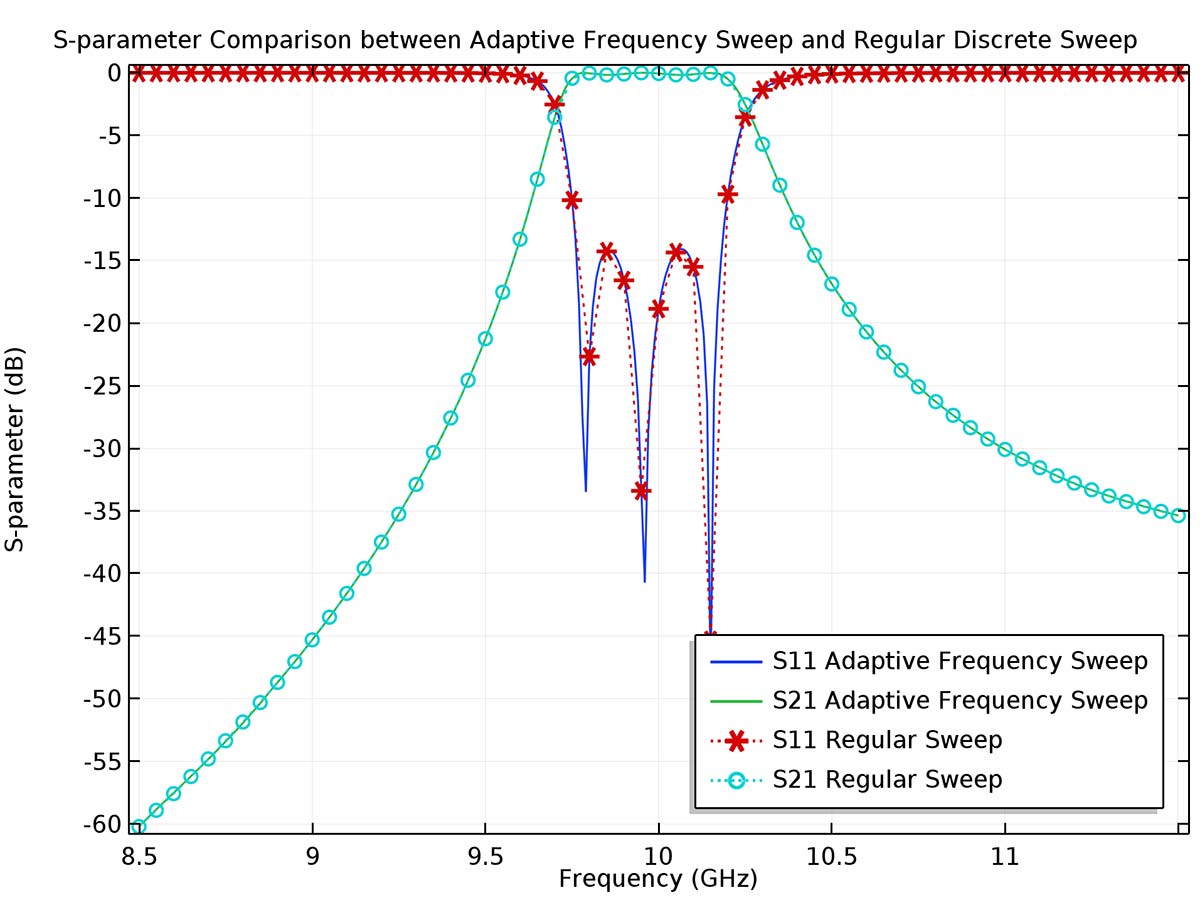 For the waveguide iris filter model, an S-parameter comparison between adaptive frequency sweep and regular sweep is shown. The simulation can be run with a 10 times finer frequency resolution in a similar amount of time as with the discrete sweep simulation.